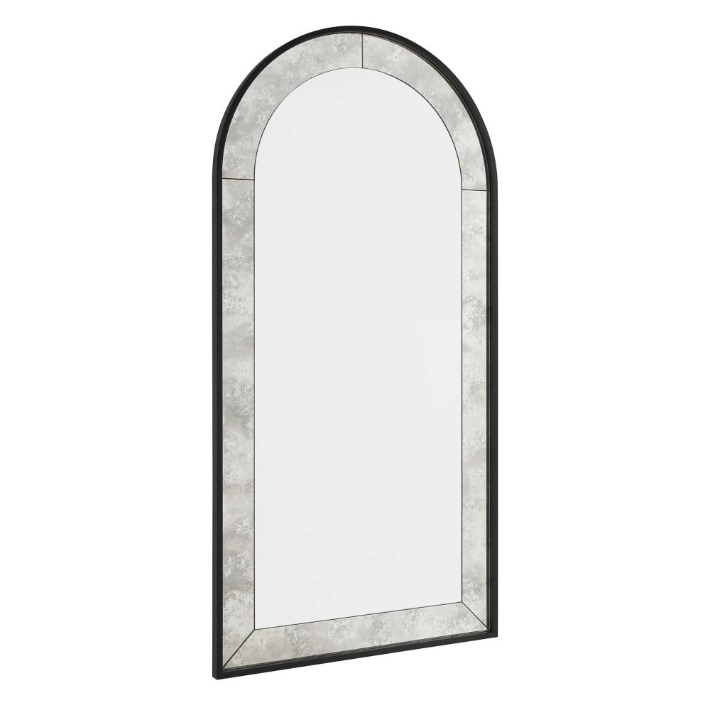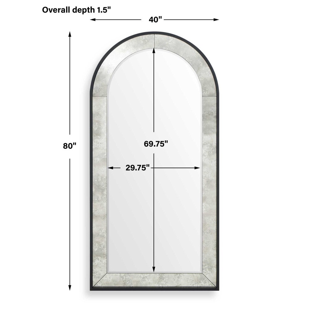 This Oversized Arch Mirror Features Antique Style Mirror Wrapping The Outer Edge Encased By A Thick Black Iron Frame.