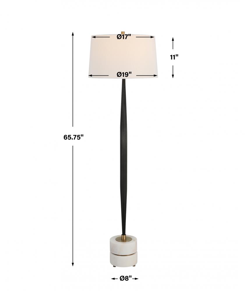 The Miraz Lamp Oozes Sophistication with Its Channeled Cast Iron Base, Brushed Brass Accents, and A Considerable White Marble Foot. The Tapered Hardback Shade is Covered in A White Cotton Fabric.