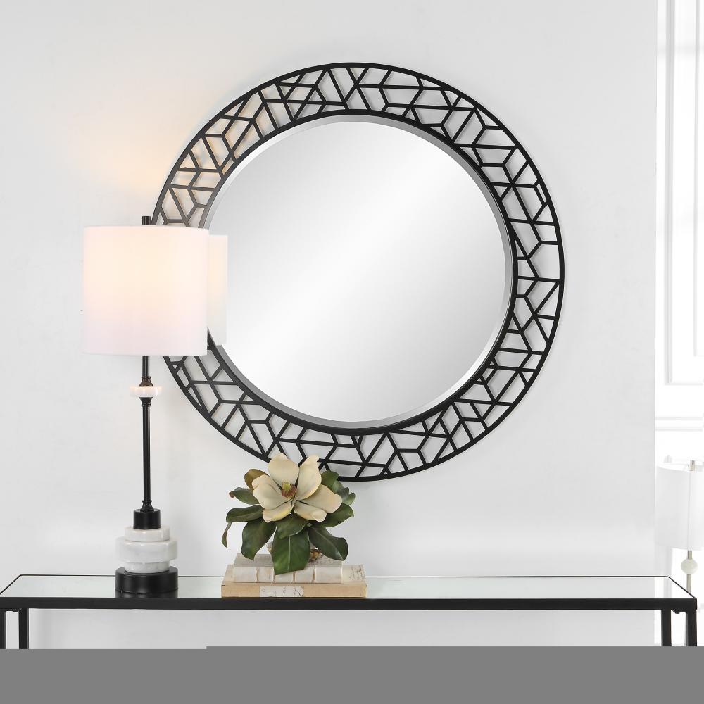 The Mosaic Mirror Displays Intricate Metalwork for A Clean Contemporary Look Finished in Satin Black. Mirror Has A 1 1/4" Bevel.