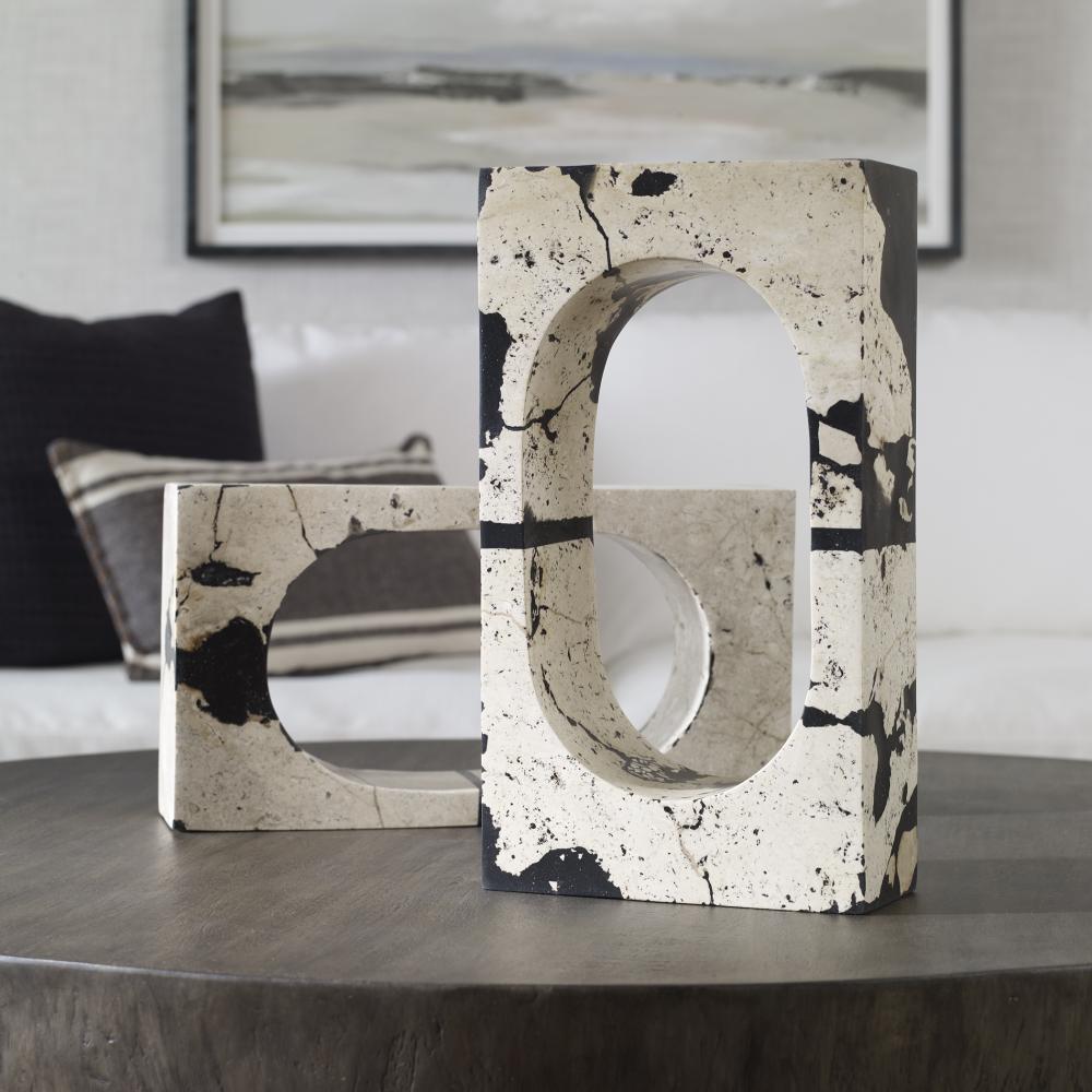 Inspired By The Clean Lines and Bold Feel of Modern Art, This Sculpture is Handcrafted From Natural White Lime Stone with Black Accents. Sold Individually.