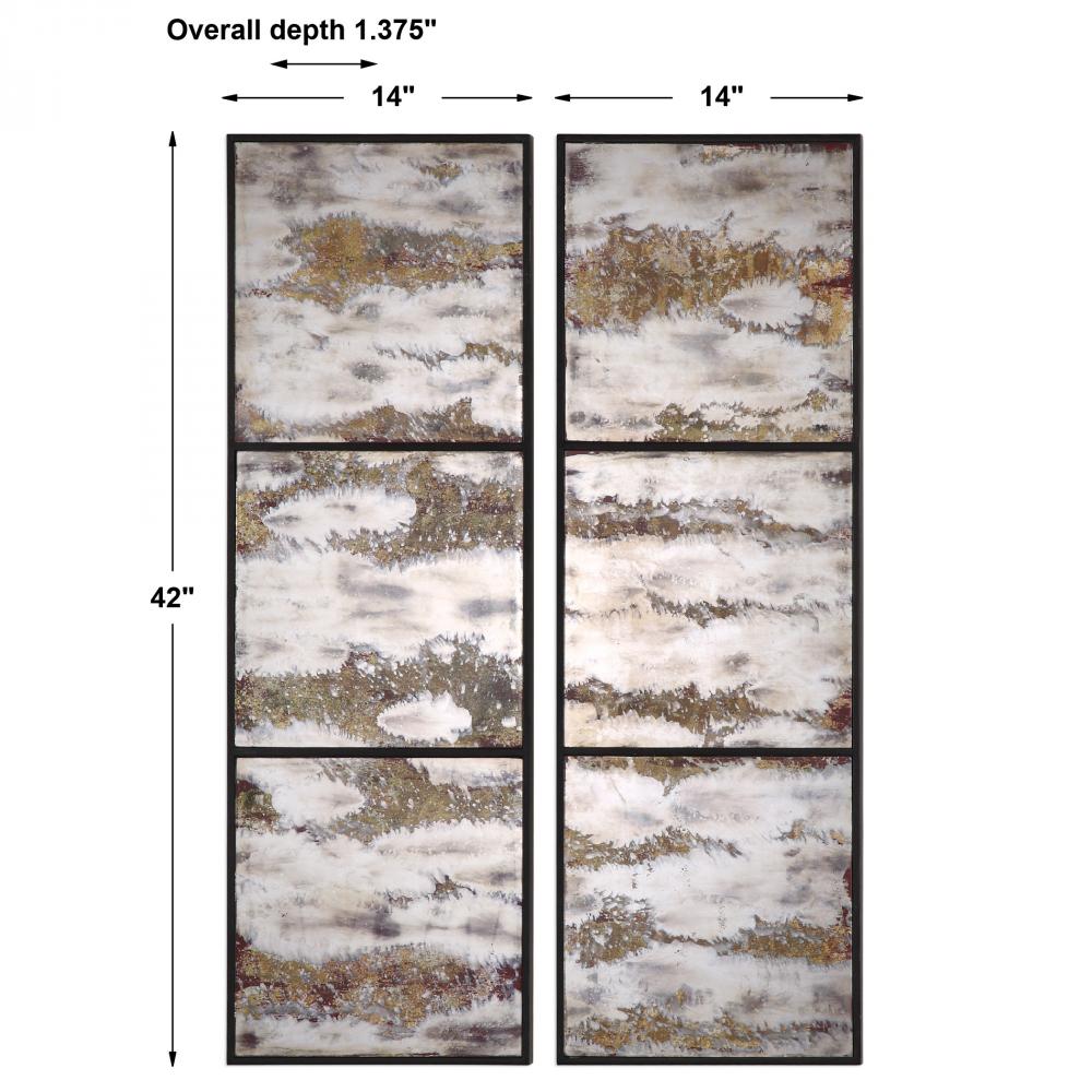 Each Panel Features Three Mirrors with A Heavily Oxidized, Antiqued Mirror in Deep Earth Tones. May Be Hung Horizontal or Vertical.