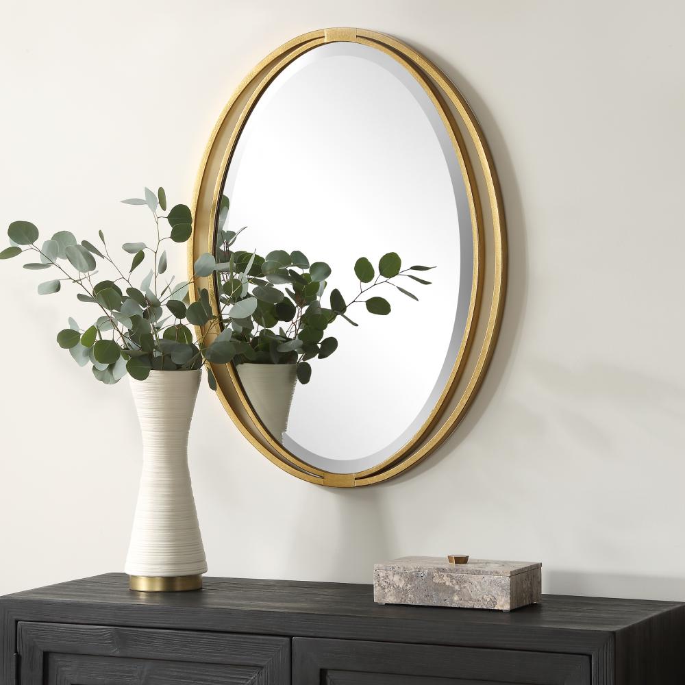The Rhodes Oval Mirror Features An Oval Outer Iron Frame Surrounding An Inner Oval, Finished In A Antiqued Metallic Gold Leaf, Adding Sophistication To Any Room.