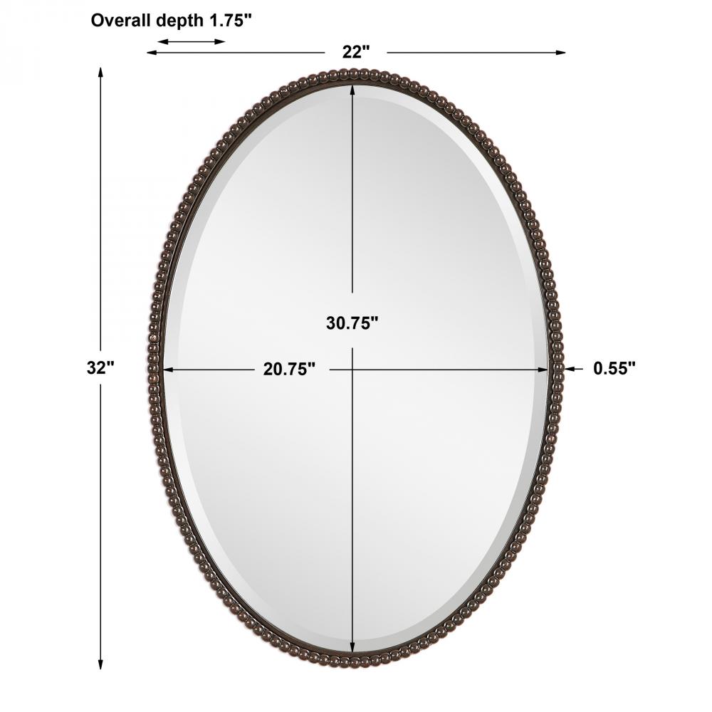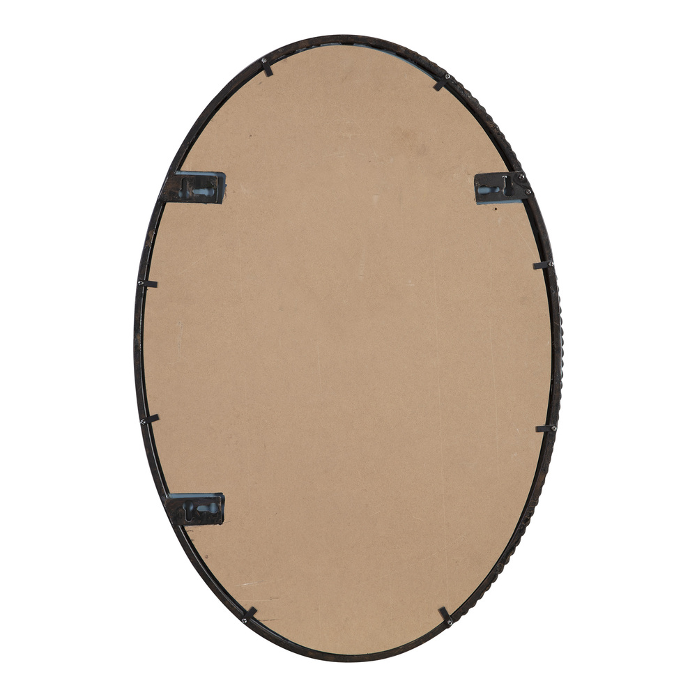 This Oval Mirror Features A Beaded Frame Made of Hand Forged Metal Finished in Lightly Distressed, Oil Rubbed Bronze. Mirror is Beveled.