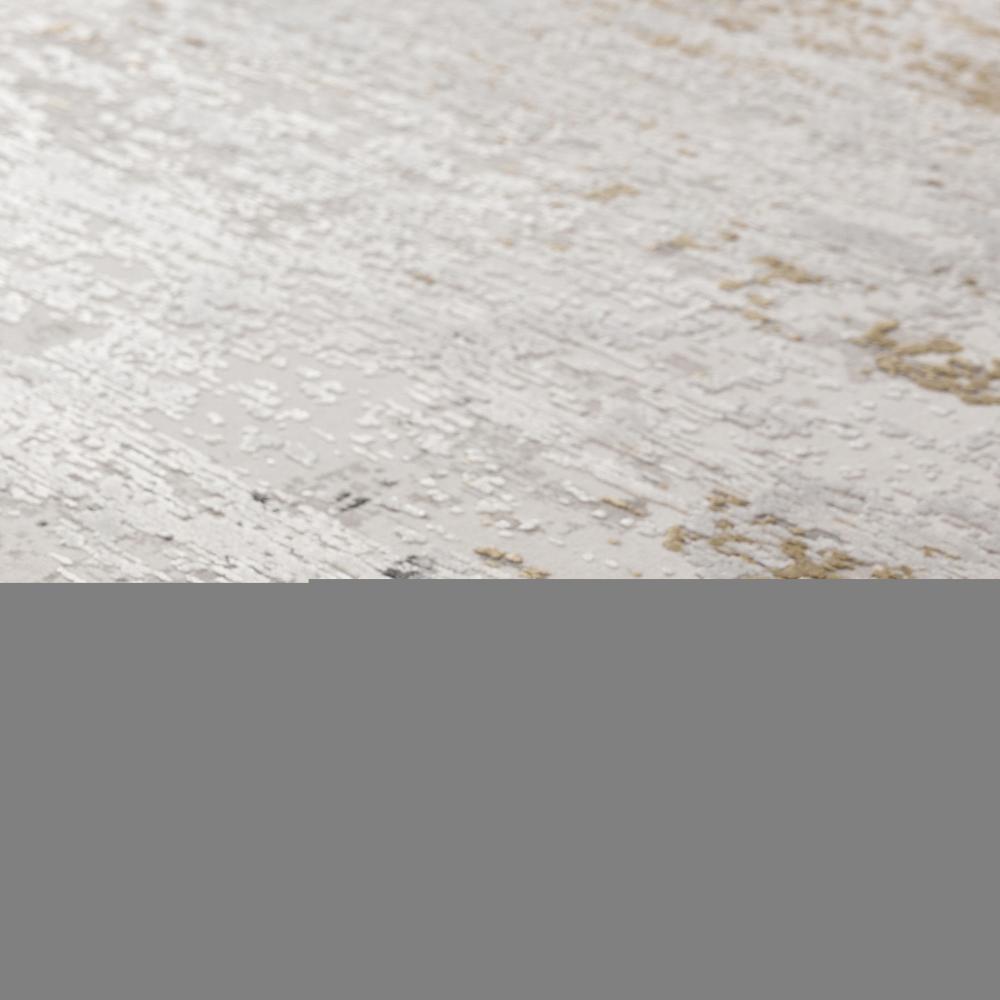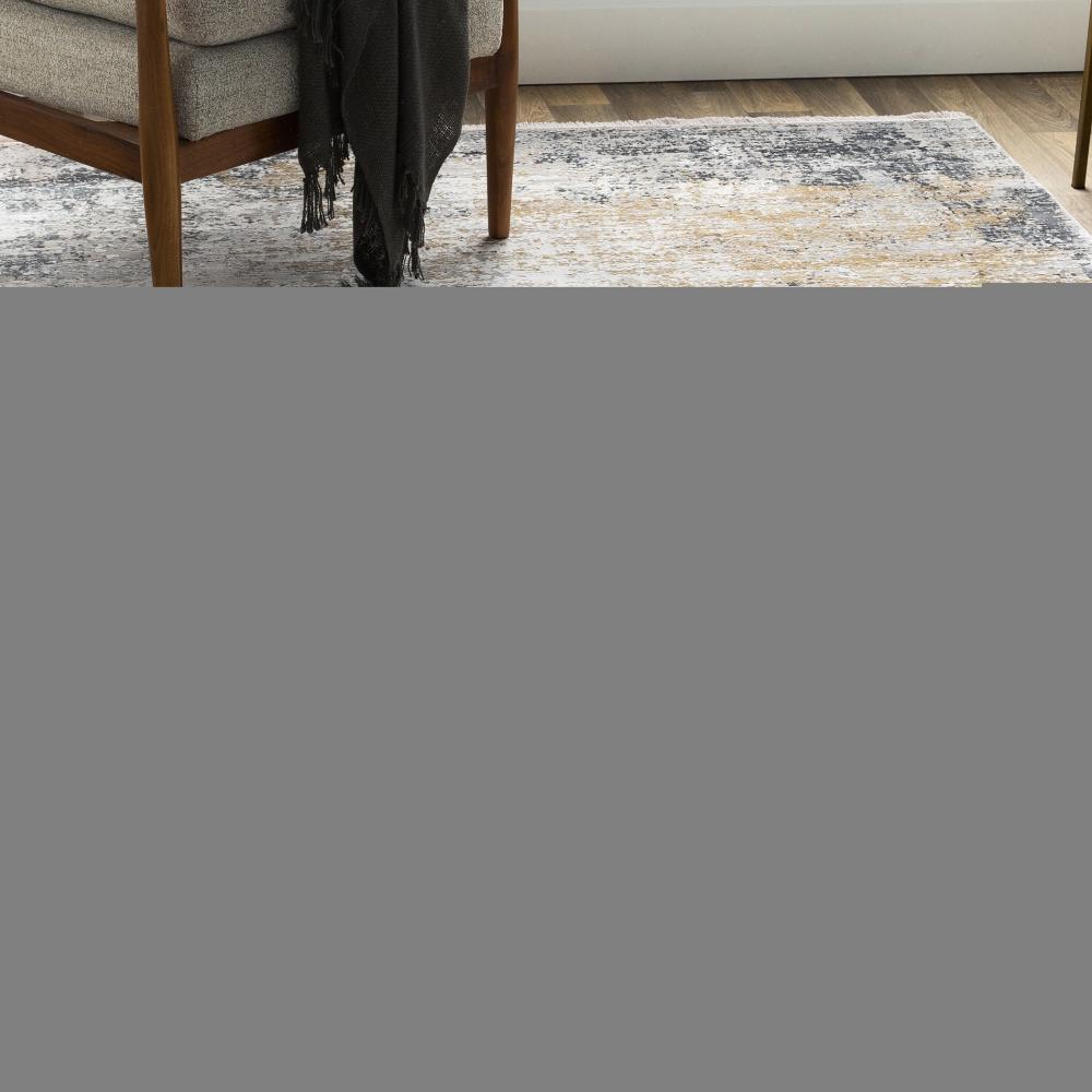 This Machine Woven Rug Features An Abstract Design in Tones of White, Charcoal, Saffron and Subtle Light Gray, Constructed From A Mix of Lustrous Viscose and Acrylic for A Soft to The Touch Feel.