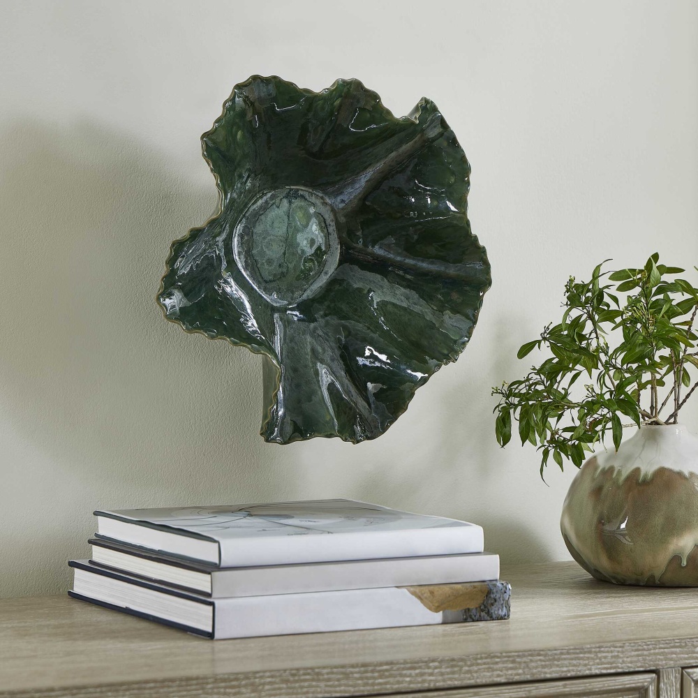 Inspired By Nature, This Striking Bowl Features An Organic, Flower-like Form With A Rich, Glossy Emerald Glaze. Its Fluid Shape And Intricate Textures Make It A Stunning Statement Piece, Perfect For Adding An Artistic Touch To Any Space. May Be Hung On Wall Or Used As Tabletop Accessory. Safe For Outdoor Use, But Protection From Freezing Temperatures Is Recommended.