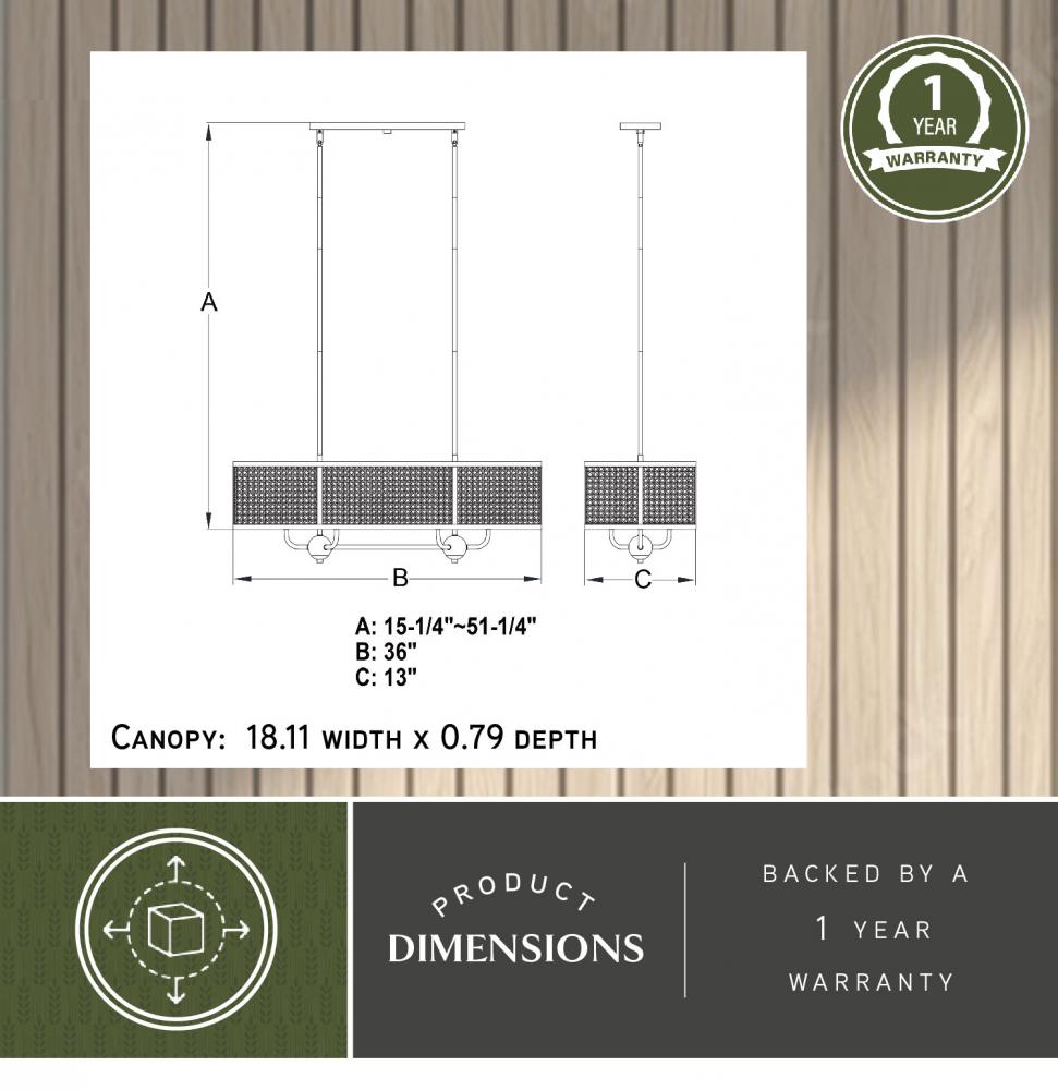 The Berens interior lighting collection speaks loudly to modern farmhouse and coastal charm. The woven linear rattan shade combined with a matte black finish provides style and lighting to your indoor areas. Pendant height is adjustable with the included downrods; compatible with vaulted ceilings. This natural cane linear chandelier would be a stunning addition to any kitchen or dining area.