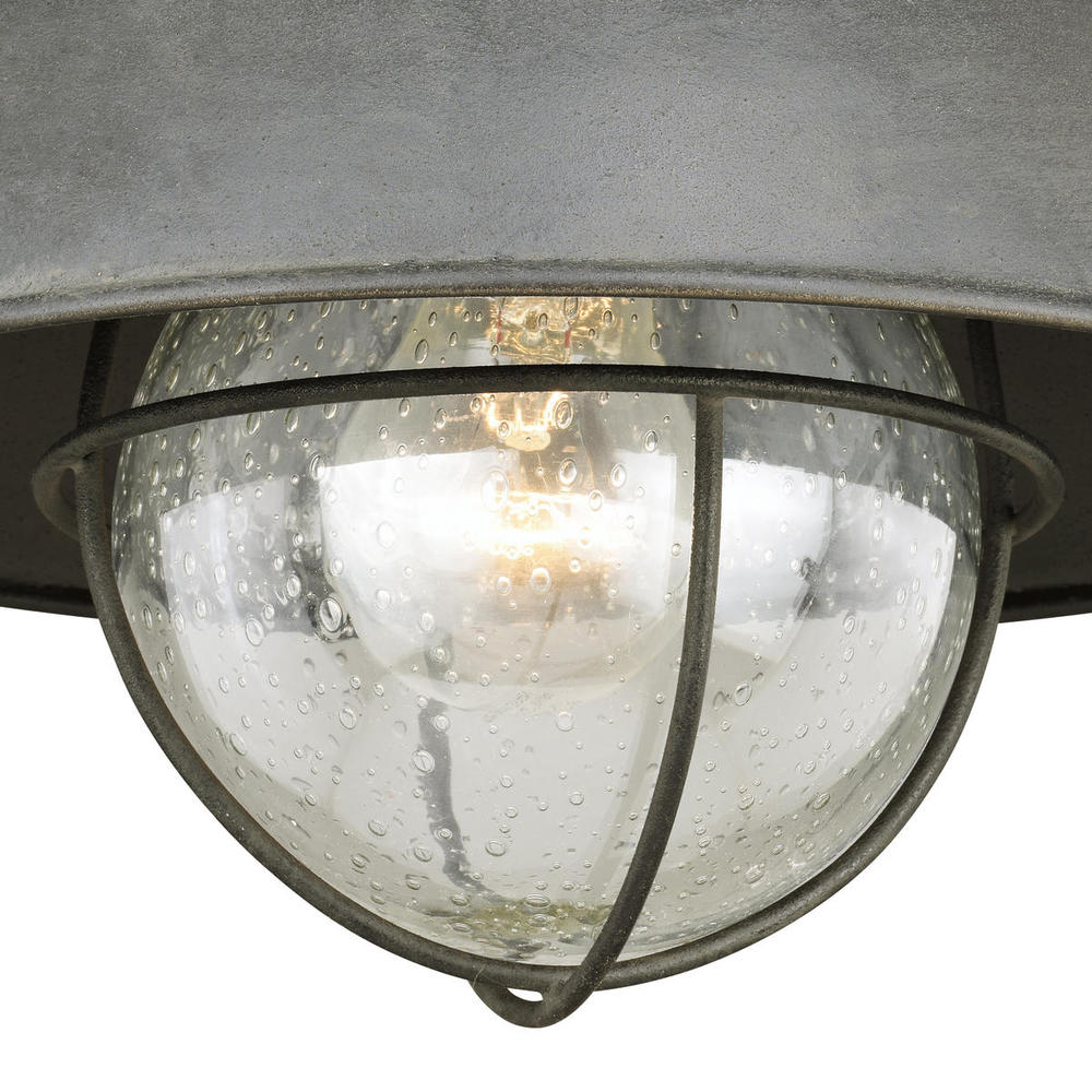 The Harwich flush mount barn light features a textured gray finish with clear seeded glass shade. Its iconic nautical-style is at home in a cottage, country or coastal setting and is exactly what is needed to add style and distinction to any entryway, porch or patio area.