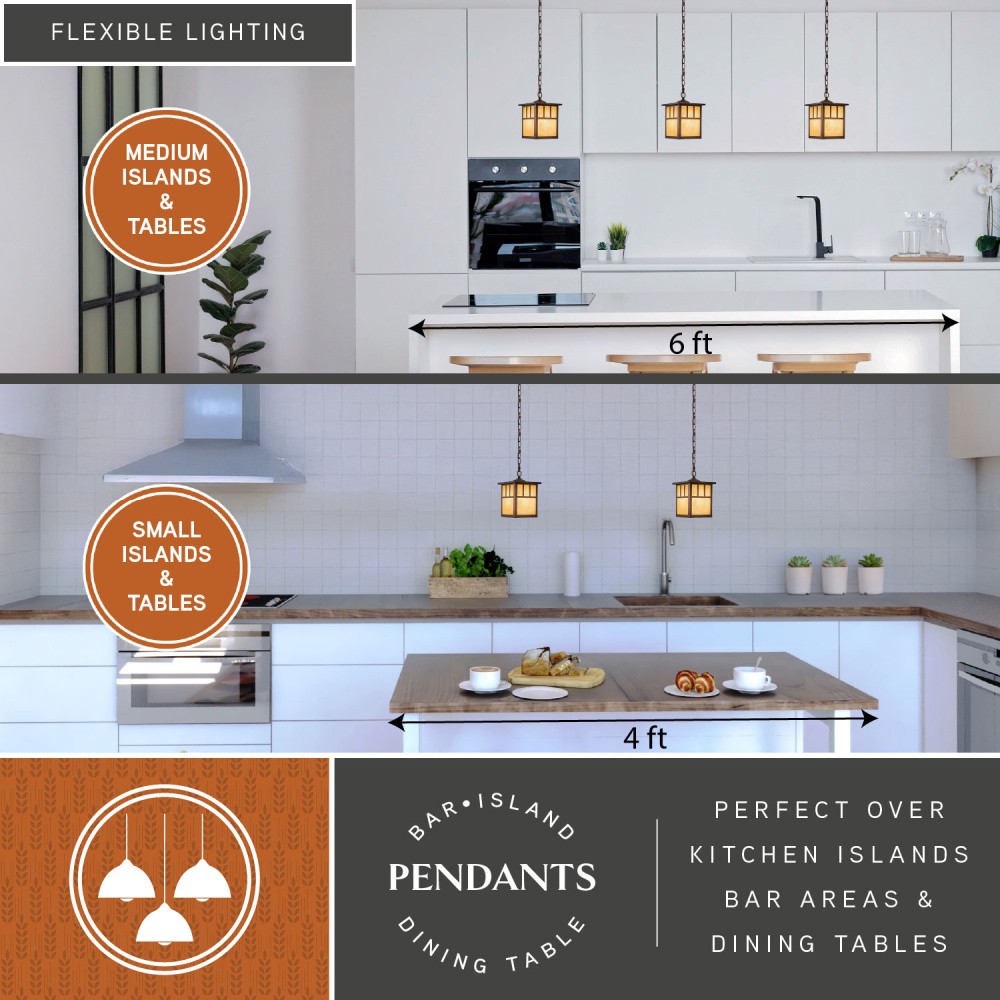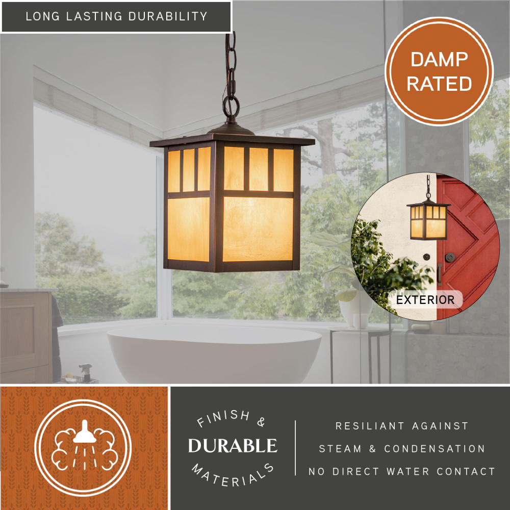 Flat strips of burnished bronze outline honey opal glass panes in the Mission collection. The simple design of this fixture has a mission style look perfect for Frank Lloyd Wright prairie inspired decors. This outdoor pendant is ideal for your porch, entryway, or any other area of your home.