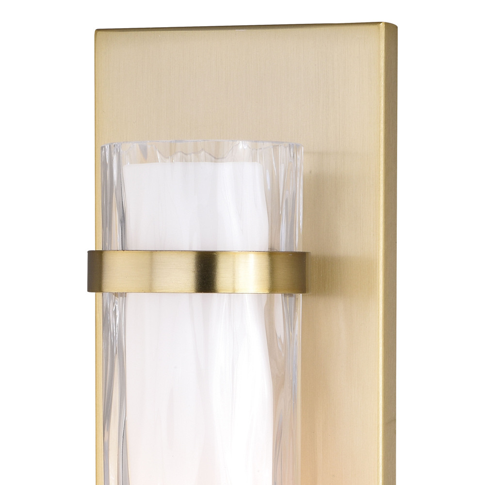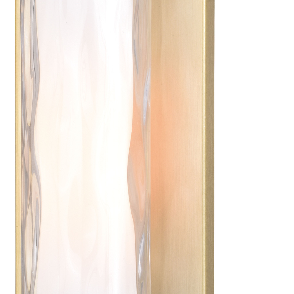 The Vilo collection is a perfect blending of simplicity and sophistication. Flat planes and bands of natural brass are a striking compliment to the more softly defined columns of water glass. Ample light emanates from the vertical glass shades creating a dramatic effect. These wall mounted fixtures offer a classy touch to any contemporary space of the home.