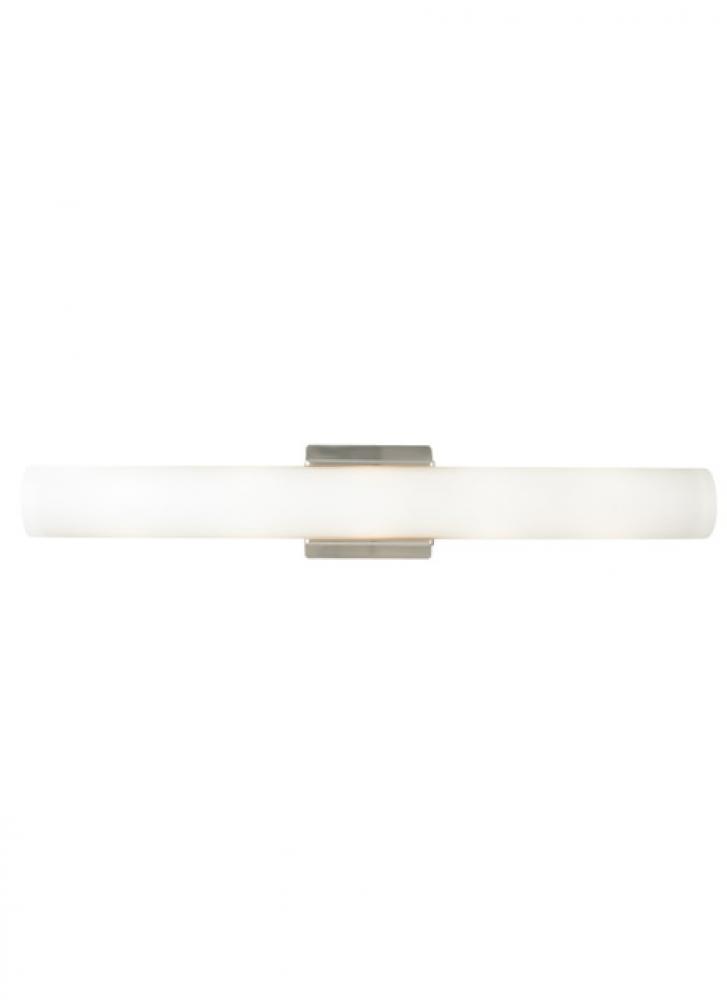 The Solace Bath bar light by Visual Comfort Modern Collection seems to float effortlessly as it features a clean frosted shade that rests on a minimal metal base. The sleek plate of glass floats in front of a smooth lighting channel providing flawless and even illumination. Scaling at 4.5” in width and 26” in length, the Solace bath light provides general and ambient illumination in spaces such as powder rooms and master bathrooms. Available in modern finishes. Available lamping options include fluorescent and incandescent, each option is compatible with most dimmers. for a list of compatible dimmers please refer to dimming chart for more information.